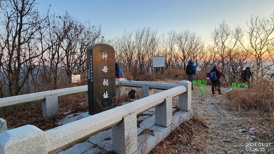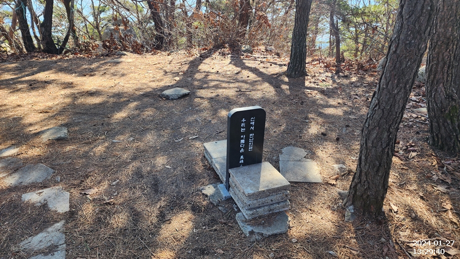 꾀나 넓게 조성된 공터에 오석의 '신모사지' 비석과 정상석이 있는 치술령 정상에 도착하는데,