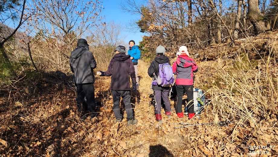 아직도 마적산을 올라야 하고 예정된 시각에 산행을 마치기 위해서는 산행을 서둘러야 하기에 365.7봉 인증만 남기고 바로 우측으로 내려서서 안부를 지나는데, 무릎 통증을 호소하던 분이 우측 제내리 마을로 탈출을 하겠다고 하여,