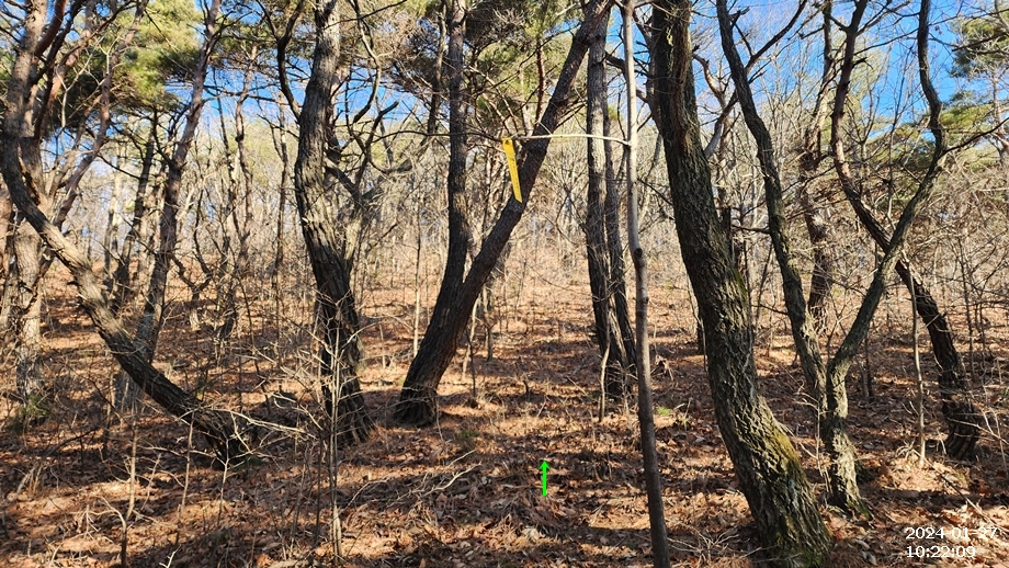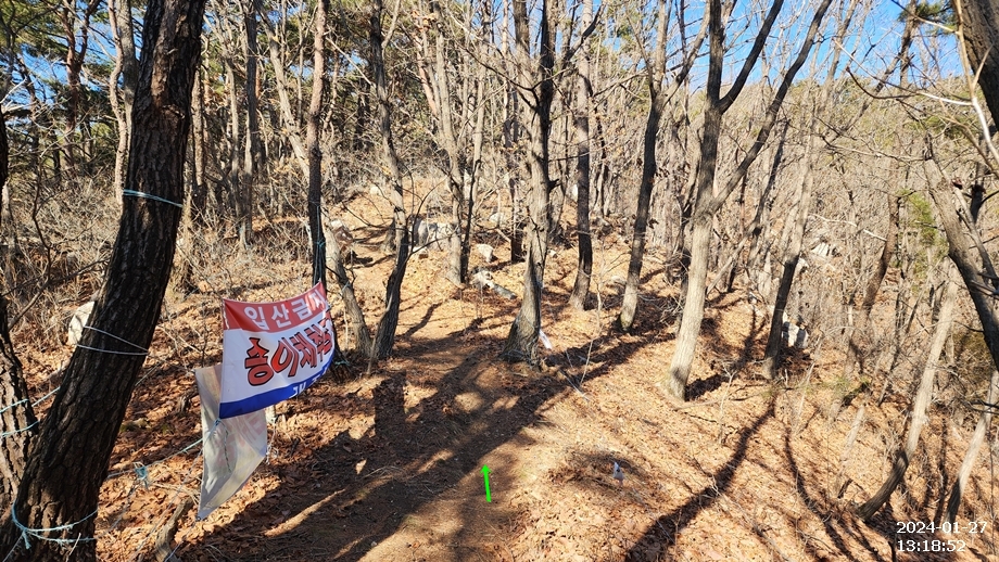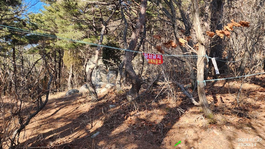 급경사 암릉 구간을 올라 다소 완만해진 능선으로 들어서자 등로 좌측으로 '송이 채취 금지'를 알리는 플래카드가 걸려있고 출입을 금한다는 하늘색 노끈이 길게 이어지며,