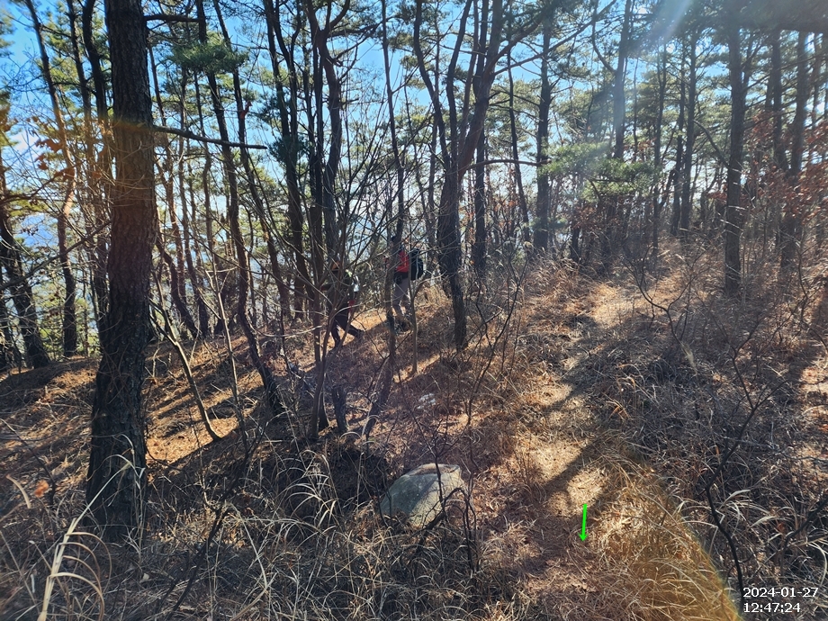 좌측의 불명확한 기맥길을 두고 우측의 정규 등로를 따라 급경사의 암릉을 내려서다가 다소 완만해진 능선으로 접어들면 잔디가 없어져 봉분 흙이 드러난 묘지를 지나게 되는데,