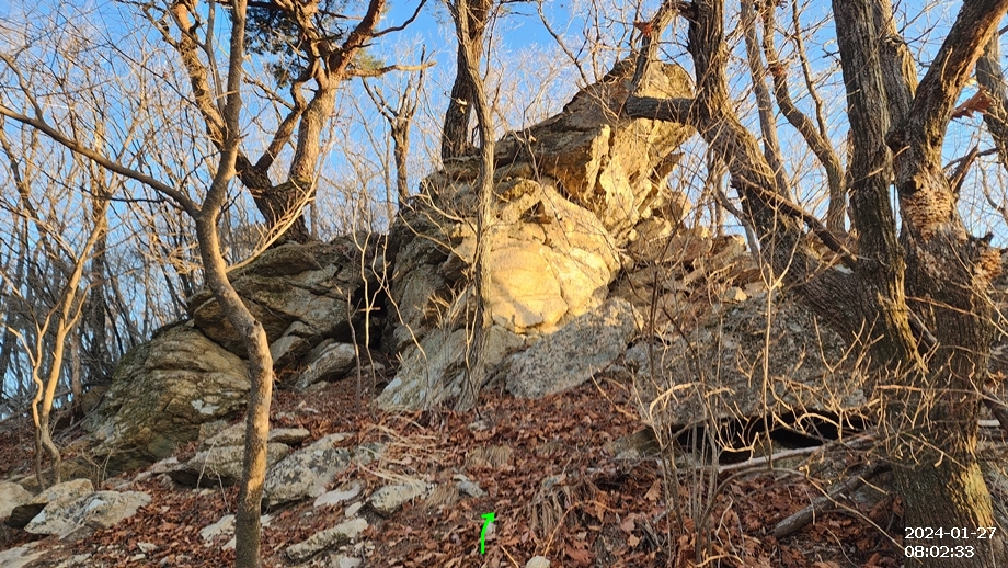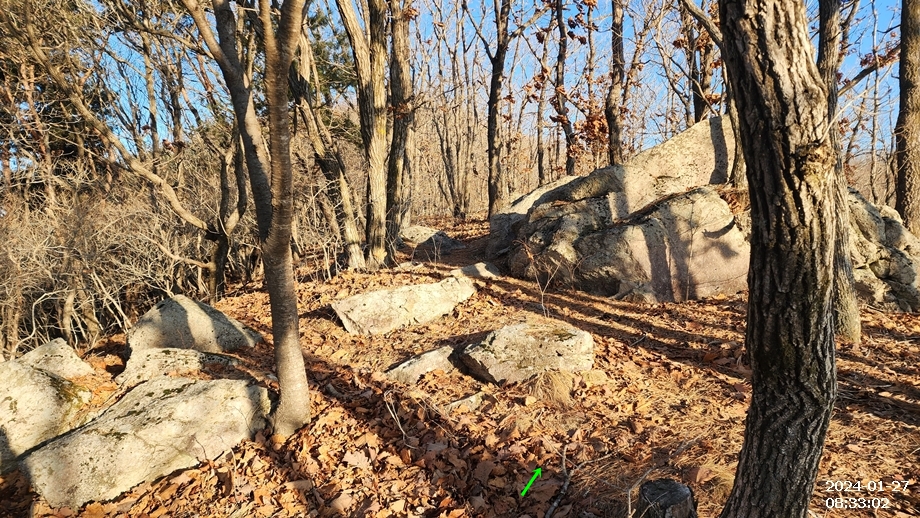 바위 전시장이 있는 지점이 지능선 분기점으로, 기맥길은 우측 지능선으로 이어지고, 정규 등로는 직진의 능선으로는 급경사의 암릉 등로가 이어지는데, 어느 쪽으로 진행해도 북토마을 뒤에서 다시 만나게 된다.