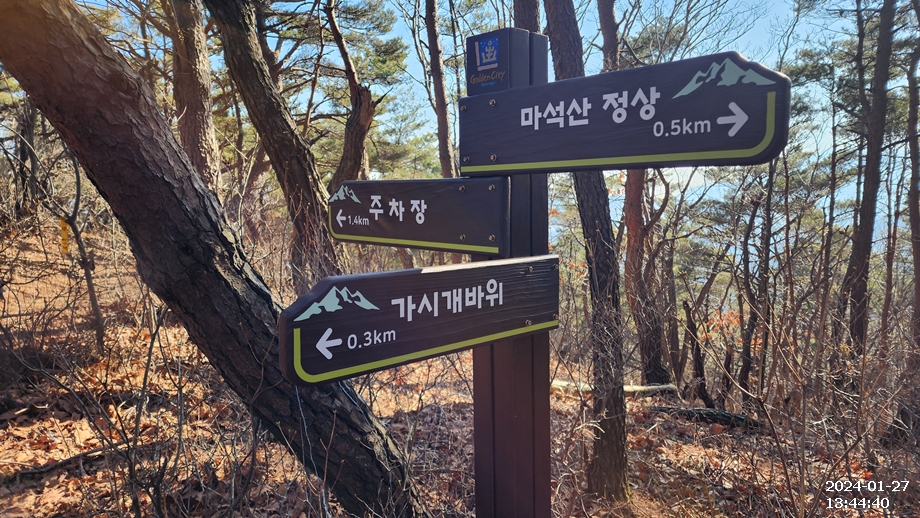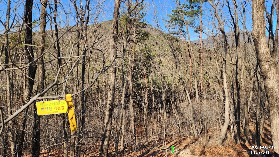 갈림길에서 좌측 270.6봉에 올랐다가 되돌아와 우측 '마석산 가는 길'이란 노란 팻말 방향으로 진행하게 되는데,