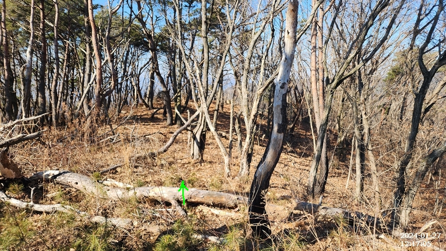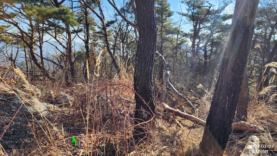 산불 흔적인 검게 그을린 소나무 둥치들이 남아있는 능선에 올라 거칠어진 능선을 잠시 더 헤치며 나아가면,