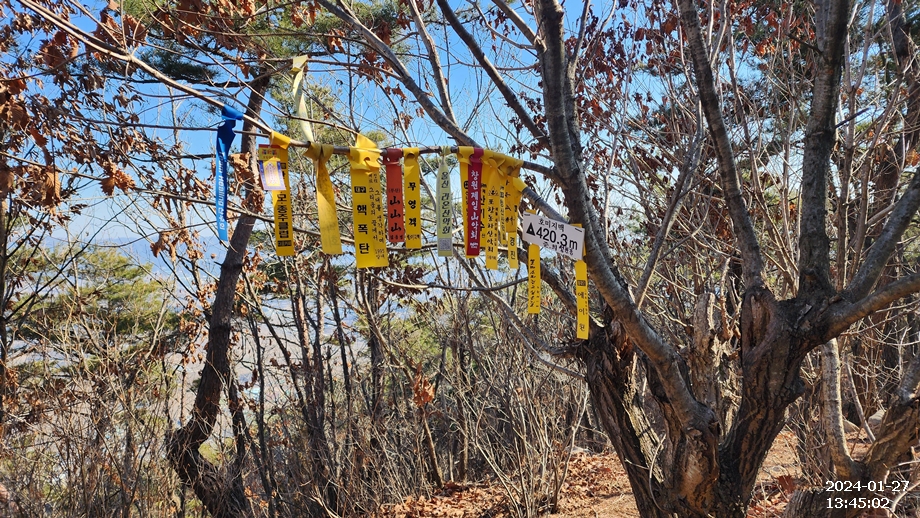 등로 좌측으로 약간 비켜나 있는 420.3봉이 나오는데, 삼각점과 '호미기맥 420.3m(성원봉)' 산패와 함께 수많은 기맥꾼들의 흔적이 남겨져 있다.
