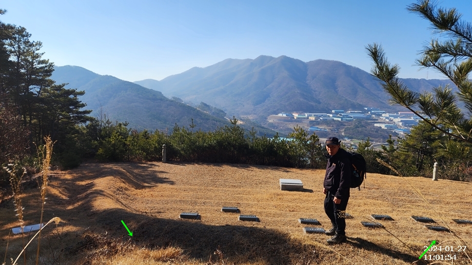 혹시 탈출하는 등로가 있을까 하고 우측을 기웃거리는데 등로 우측의 묘지에서는 지나 온 묵장산 능선에서 이어져 오는 기맥 능선이 가늠되고,
