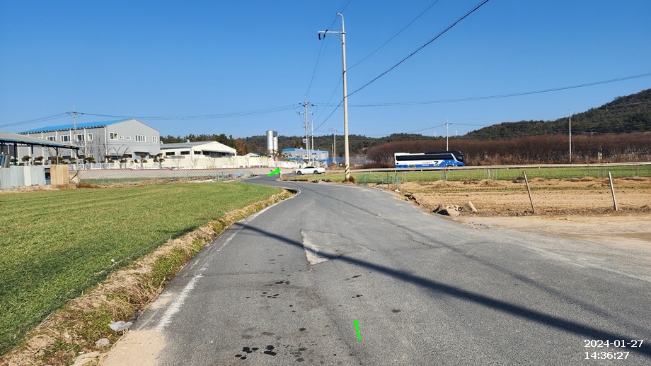 북토마을 앞에서 들판으로 이어진 마을 진입도로를 따르면,