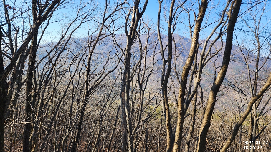치술령 능선을 따라 나뭇가지 사이로 건너다 보이는 묵장산을 향하면,