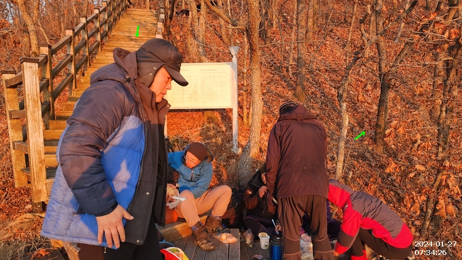 찬바람을 피해 망부석 안내판 앞에서 아침식사를 하는데,