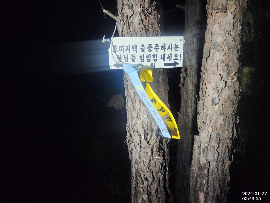 나뭇가지에 걸린 '준·희'님의 격려문이 캄캄한 한밤에 초행의 산길을 가는 산꾼에게는 구원의 손길인양 반갑기만 하고,