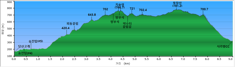 산행코스 : 당산고개(170m) ~ 외동 갈림길 ~ 643.8봉 ~ 박제상(울산)망부석 ~ 치술령(766.7m) ~ 치술령(경주)망부석 ~ 721봉 ~ 묵장산(781.2m) ~ 700.7봉 ~ 서라벌CC ~ 421봉 ~ 사일고개/서낭재(226m, 904번지방도) ~ 327.5봉 ~ 제내고개(7번국도) ~ 270.8봉 ~ 365.7봉 ~ 마석산(531m) ~ 420.4봉 ~ 북토마을 ~ 북토교(원동천) ~ 득전농장 ~ 순지마을/태화식품 사거리 (21km, 9시간 소요)