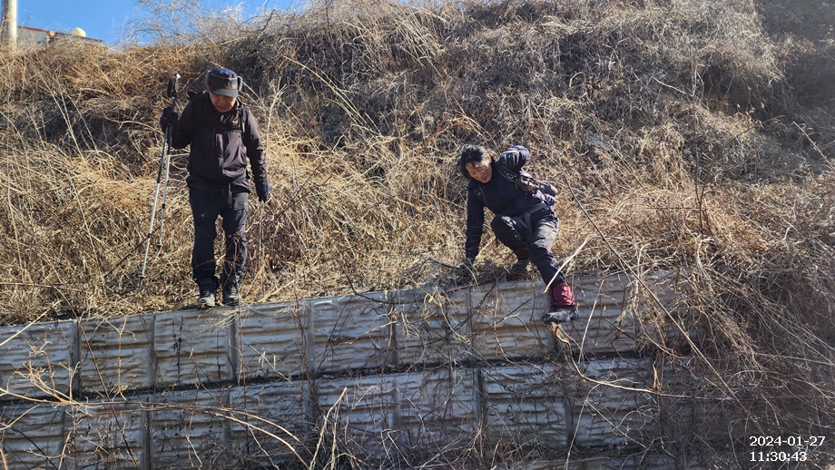 길 건너편 축대가 끝나는 지점의 들머리로 들어서며 호미기맥 두번째 산행을 시작한다.